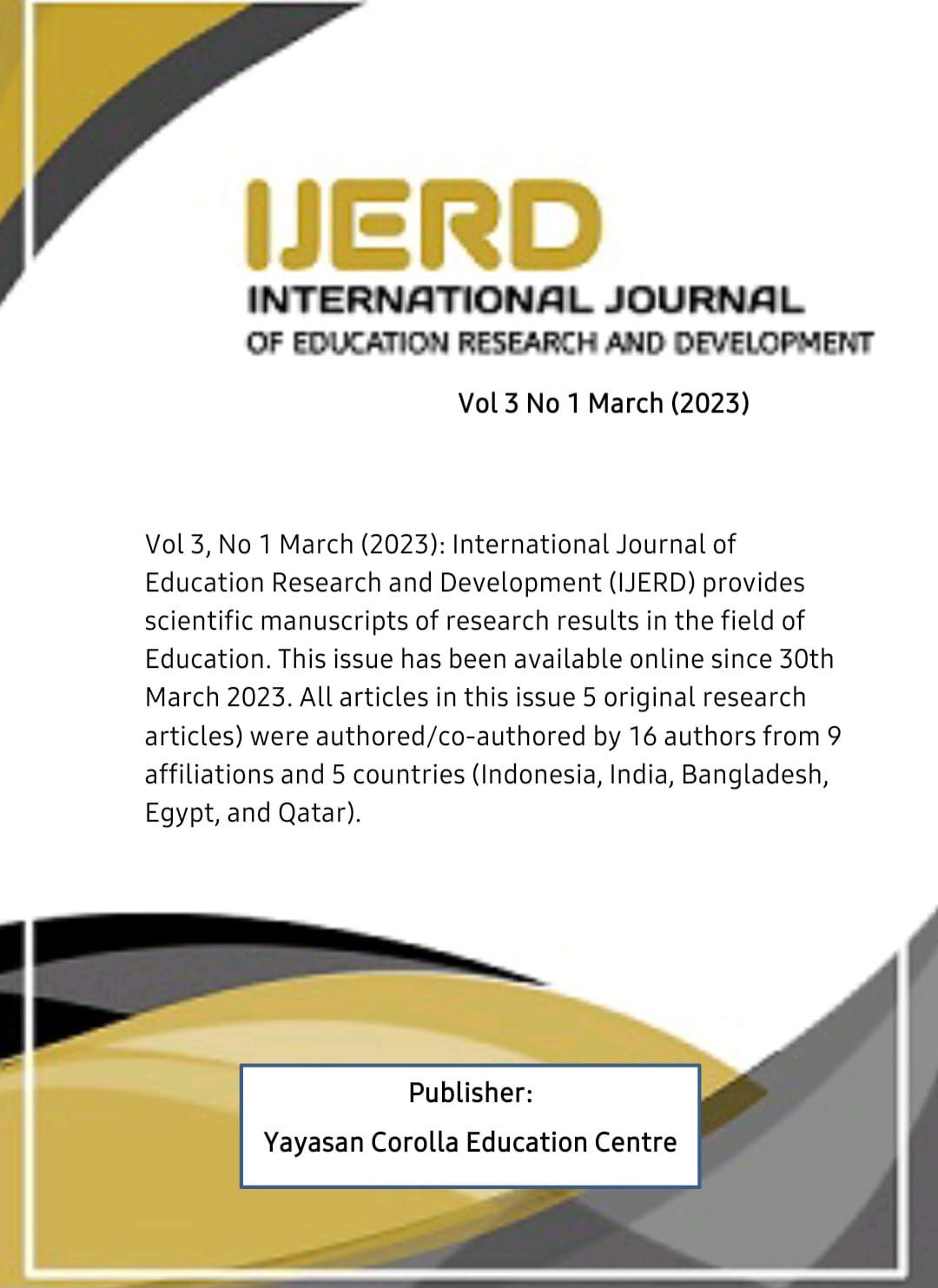 ##issue.vol## 3 ##issue.no## 1 (2023)Vol 3, No 1 March (2023): International Journal of Education Research and Development (IJERD) provides scientific manuscripts of research results in the field of Education. This issue has been available online since 30th March 2023. All articles in this issue 5 original research articles) were authored/co-authored by 16 authors from 9 affiliations and 5 countries (Indonesia, India, Bangladesh, Egypt, and Qatar).